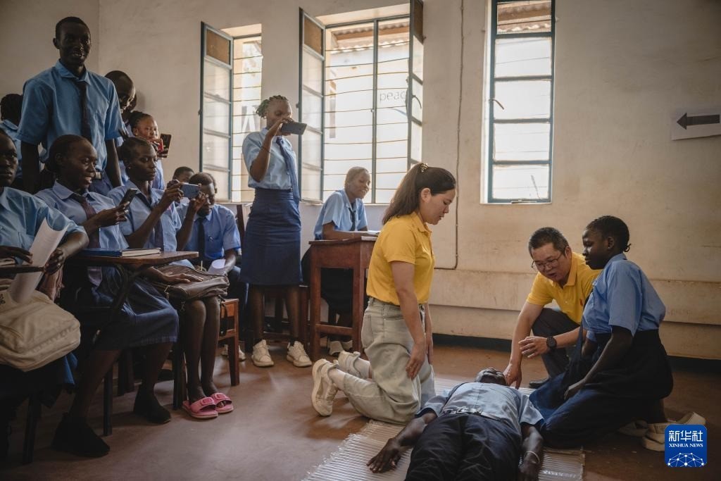 2月25日,第12批中国援南苏丹医疗队麻醉科医生周涛(右二)和手术室护士阮书琴在南苏丹首都朱巴的朱巴健康科学学院内指导学生练习心肺复苏术。