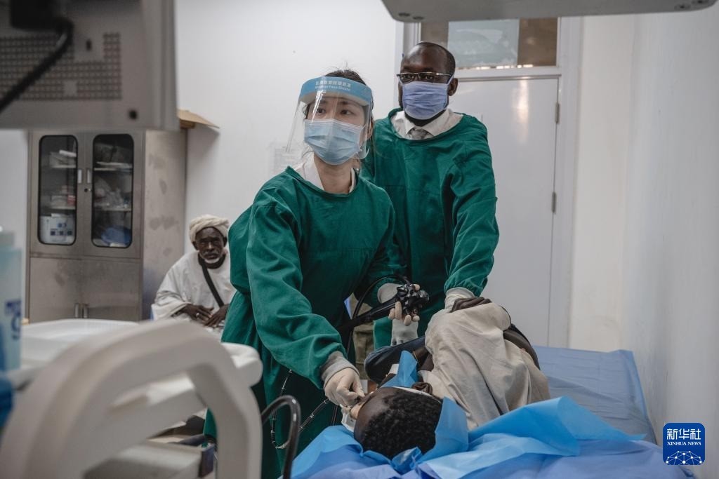 2月26日,第12批中国援南苏丹医疗队消化科医生丁云在南苏丹首都朱巴的朱巴教学医院内为患者进行胃镜检查。