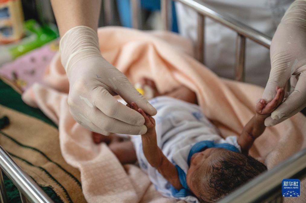 2月26日,第12批中国援南苏丹医疗队儿科医生在南苏丹首都朱巴的朱巴教学医院的新生儿病房为儿童检查。