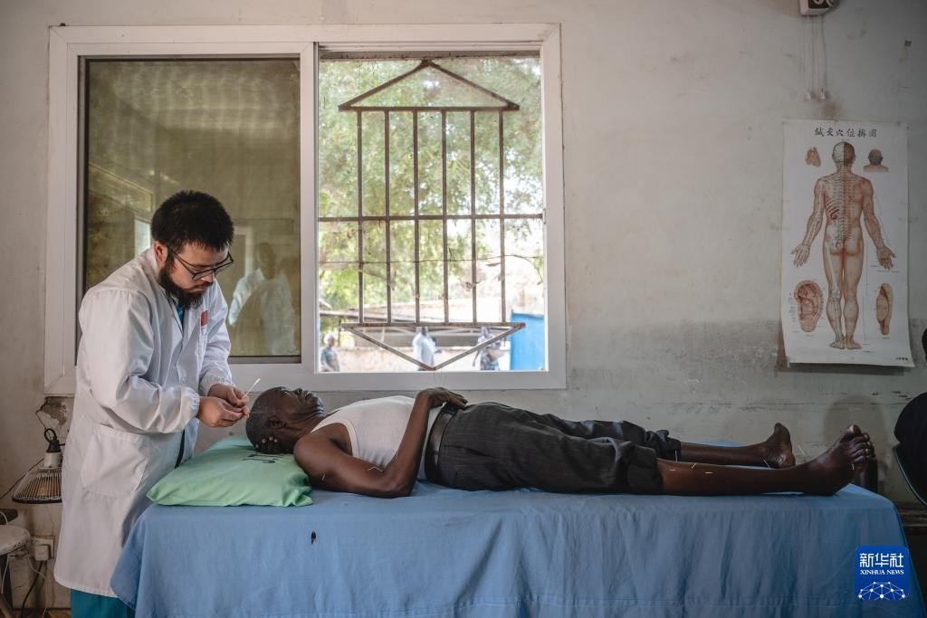 2月26日,第12批中国援南苏丹医疗队中医科医生谷绍飞在南苏丹首都朱巴的朱巴教学医院内为患者进行针灸治疗。
