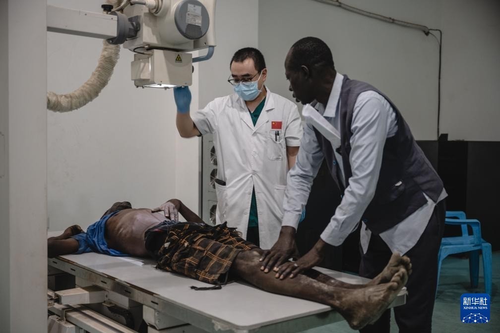 2月26日,第12批中国援南苏丹医疗队放射科医生梁策在南苏丹首都朱巴的朱巴教学医院内为患者进行X光检查。